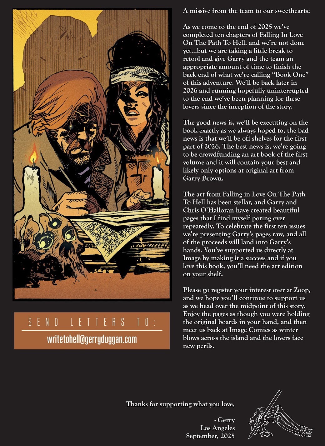 Here's a letter from Gerry Duggan published in the back of October's Falling in Love on the Path to Hell #10 through Image Comics that explains where they are with the series and why now is the perfect time to release this art edition: