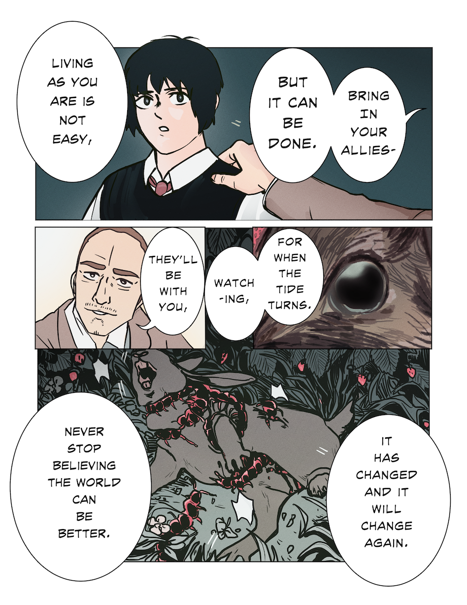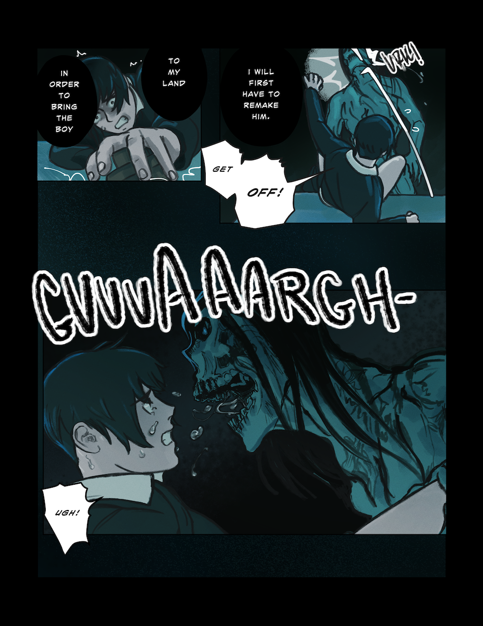 When I set out to create LITTLE DEATH, I wanted to make dark queer erotica that is just as in love with the Monstrosity as it is with the blameless and victimized. A story where a happy romantic ending should be impossible for the two main characters because Callisto abuses his supernatural necromancer powers to taunt, humiliate, hurt, and scare Ellery. Yet even with these barriers to intimacy, Ellery and Callisto still feel drawn towards safeguarding the other’s innermost vulnerabilities. This comic contains gore, and imagery depicting self harm, suicide, and depression.