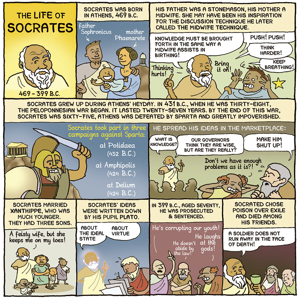 Besides exploring some of the Big Questions, this book also provides drawn biographies of a few key philosophers and an overview of their ideas: