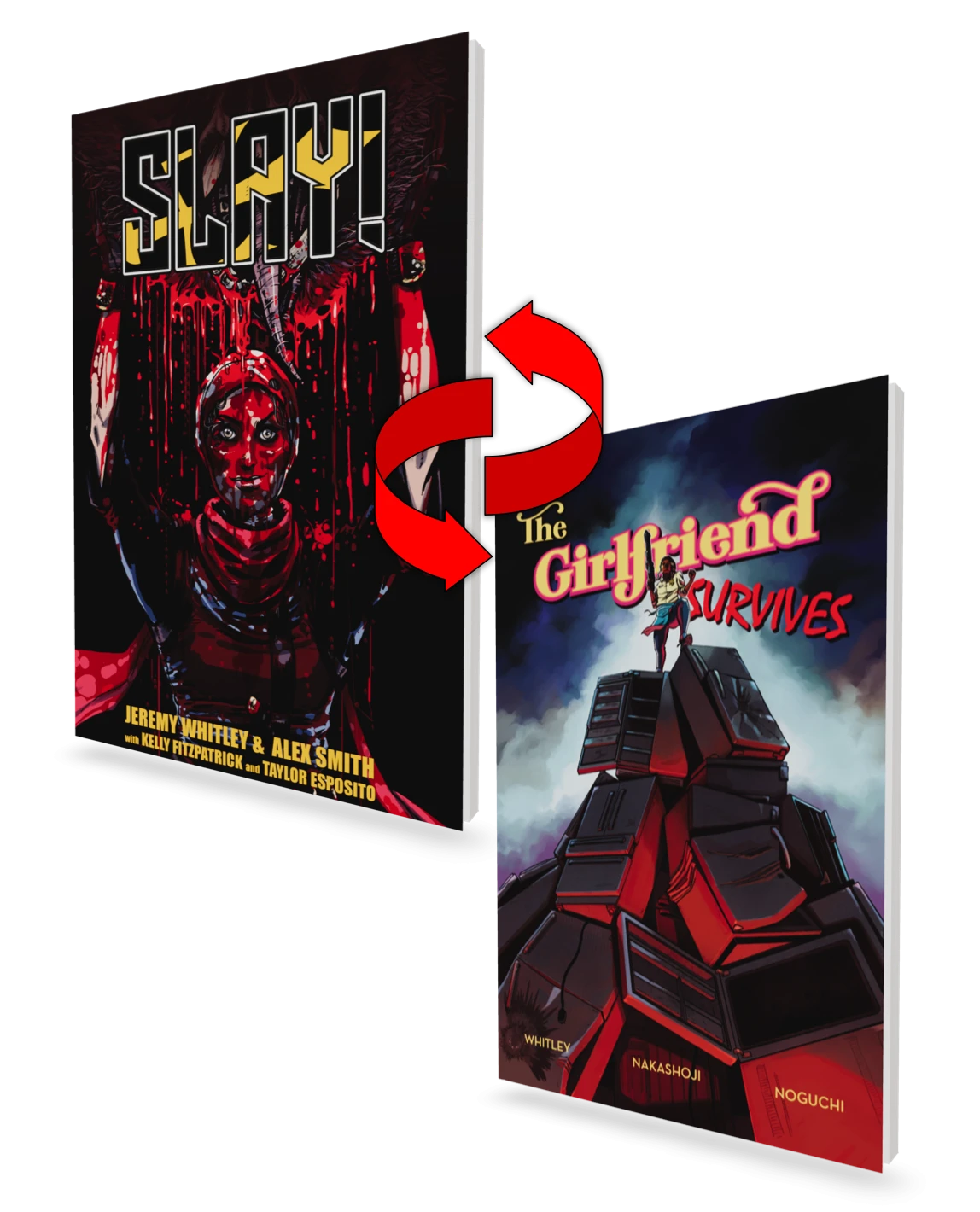 On one side it's the first issue of fantasy-horror-western SLAY! by Writer Jeremy Whitley, Artist Alex Smith, Colorist Kelly Fitzpatrick and Letterer Taylor Esposito, and on the other-side the The Girlfriend Survives is the first issue of a superhero story told from a perspective you've never seen before, written by Jeremy Whitley, Illustrated by Luc Nakashoji and Colored by Jamie Noguchi.